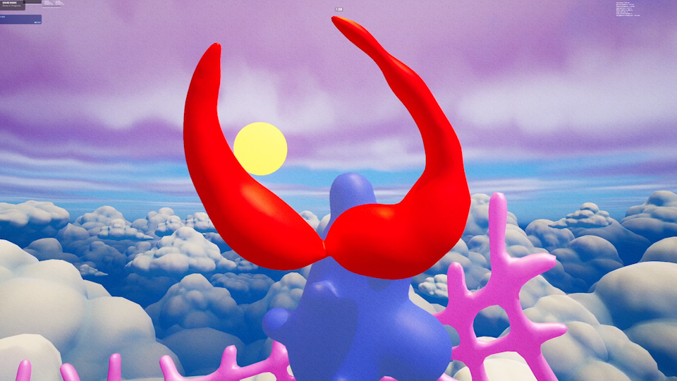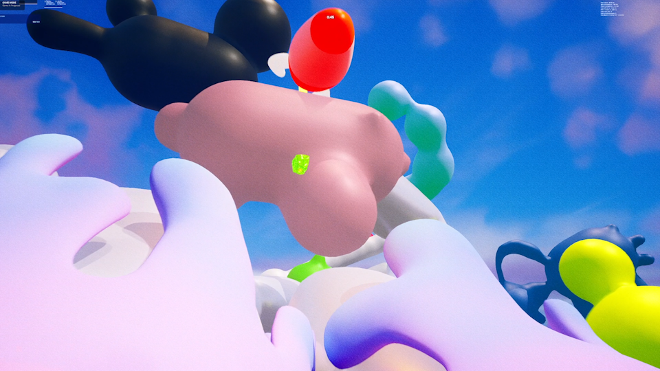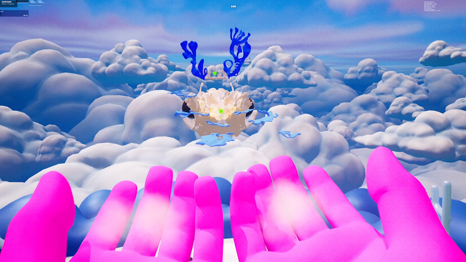 With the development of the Chasing Rainbows video game, this concept was taken further, allowing direct audience participation in a world that was previously only observed. Built within the Unreal Engine ecosystem, the game situates the player on an imaginary floating island suspended in the clouds, where the amorphic forms from my paintings hover above, shifting and reforming in an endless dance of transformation. The island itself functions as a transitional space, evoking both meditative tranquility and existential uncertainty.